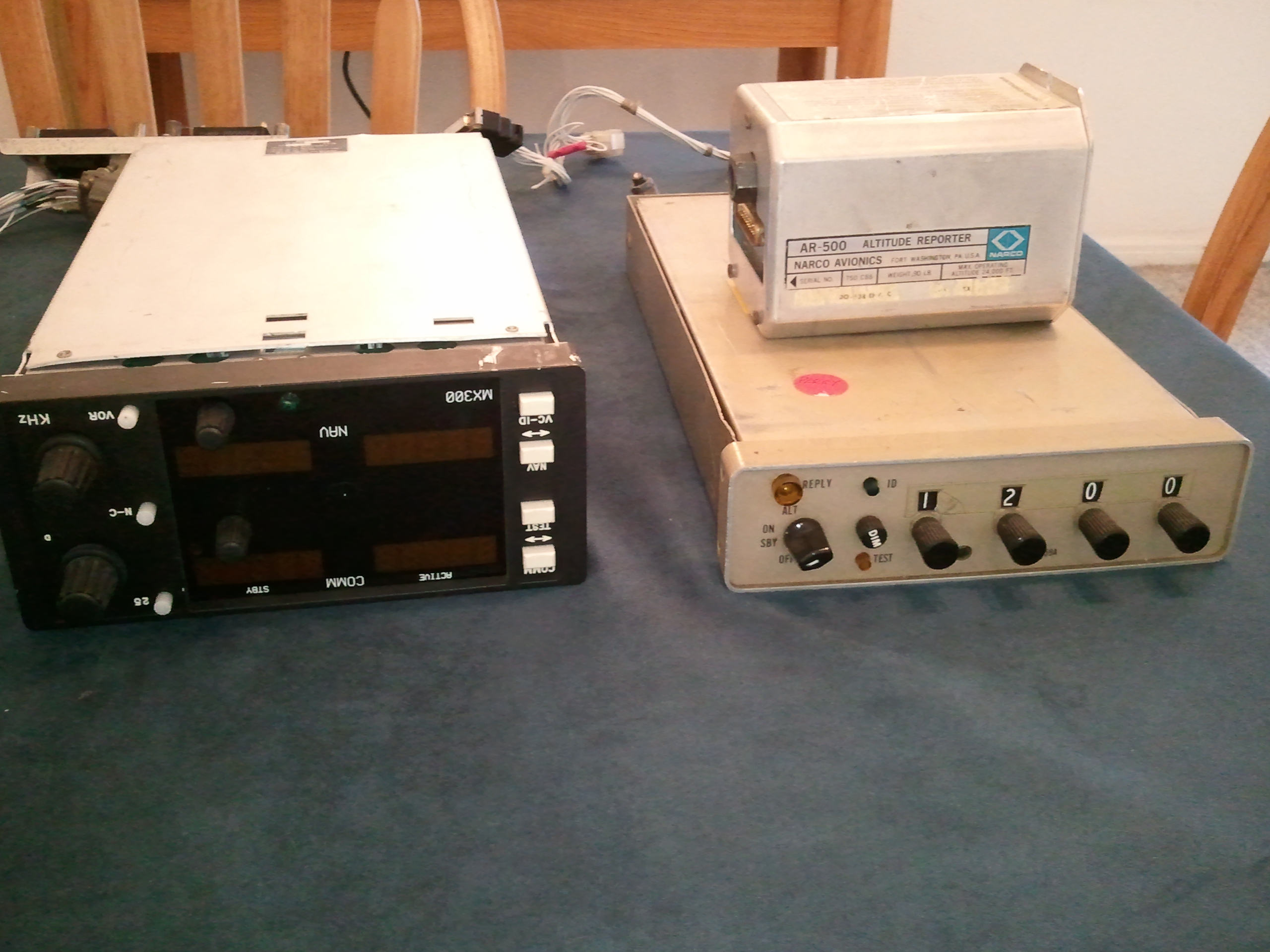 MX-300 Radio, RT-359A Transponder, and AR-500 Altitude Encoder. Used. The radio was NOT working properly when removed. My recollection is that there was something wrong with the squelch. The transponder was also NOT working properly when removed. My recollection is that there was something wrong with "the crystal (?)" when removed. The altitude encoder was working as far as I recall. In any event, none of these parts comes with a yellow tag and are NOT ready for installation as is. They might make interesting projects for an avionics tech or shop. Price: make offer. Shipping negotiable with price.